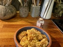 Die fein gehackten Zwiebeln in einem Schuss Olivenöl anbraten und die Safranfäden hinzugeben. Mit dem Cidre/ Cider oder Apflewein ablöschen, mit Salz und Pfeffer abschmecken.