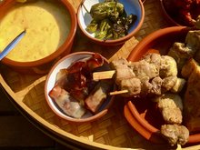 Die Fleischstücke (maximal 4 Stück) eng auf die Zahnstocher aufspießen, die Marinade soll nach dem Grillen (Braten) noch zwischen den Fleischwürfeln verbleiben.