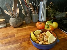 Die Hitze wegnehmen und zugedeckt ca. 10 Minuten ziehen lassen, kurz aufkochen, abschmecken und mit den Zitronenspalten servieren.