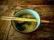 Das Hähnchenfilet, die Kaffirblätter und ca. einen halben Teelöffel Salz hinzugeben und ca. 3 Minuten Kochen.