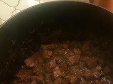 Das abgetropfte Fleisch (die Beize auffangen und zur Seite stellen) zu den Zwiebeln geben und scharf anbraten. Danach würzt man das Fleisch mit Paprika, Salbei, Salz und Tomatenmark. Mit der Beize wird das Wildgulasch abgelöscht und anschließend zugedeckt für ca. 1 Stunde geschmort, nach und nach mit Fond begiessen.