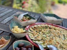 Die Zucchini in dünne Scheiben schneiden (1-2 mm) und auf einem runden großen hitzebeständigen Teller im Kreis legen, salzen und pfeffern.
